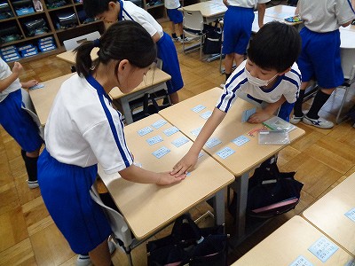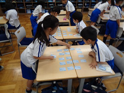 1時間目の生活科の学習は、ビオトープの観察を予定していましたが、青色かるたの復習&かるた大会を行いました。