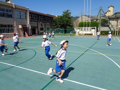 暑い中でしたが、最後までスピードをゆるめず、しっかり走りきれていました。最後はタグを腰につけて、しっぽとりならぬタグとりです。自分のタグをとられずに、友達のタグをたくさんとるというかけっこをしました。