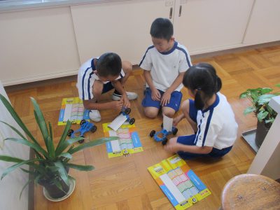 ゴムのはたらきを考えて、車を的の位置にぴったり止めるのです。