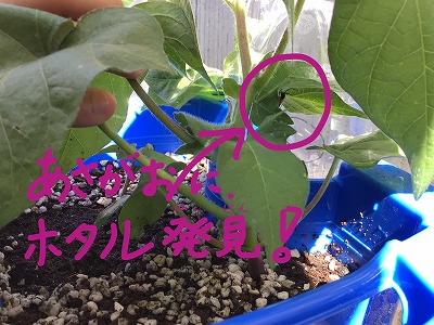 日当たりのいいアサガオの葉陰で、一休みをするホタルを、子どもたちも私も初めて見ました!