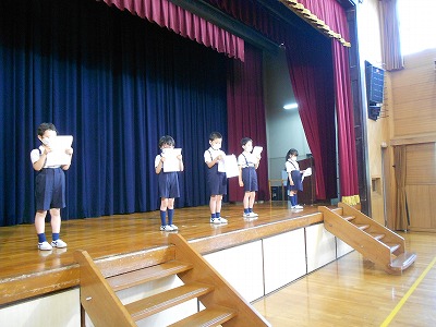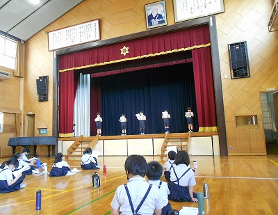 体育館で舞台練習をしました。 今日のめあては、発表の流れと立ち位置を覚えることです。