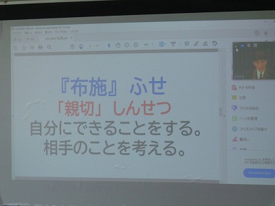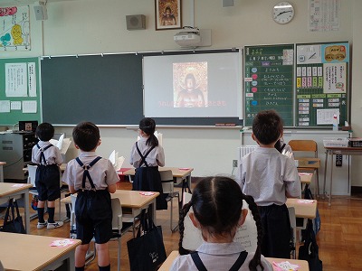 その中の「布施」も基本の行いの一つで、これは1年生の大テーマです。布施の精神で「明るい心で挨拶する子」を目標としています。布施の行いは「親切の心」や「利他の心」としても考えられます。