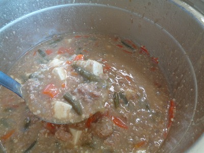 麻婆豆腐は木綿豆腐を使っています。絹豆腐に比べると、しっかり食感があって、よく噛んで食べることが意識できそうです。人参、玉ねぎ、三度豆といろいろな野菜も入って、栄養のバランスもとれるように考えてあります。