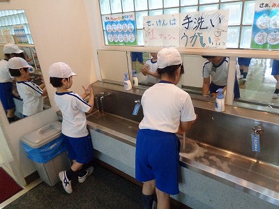 保健係さんが手洗い・うがいを促してくれていました。