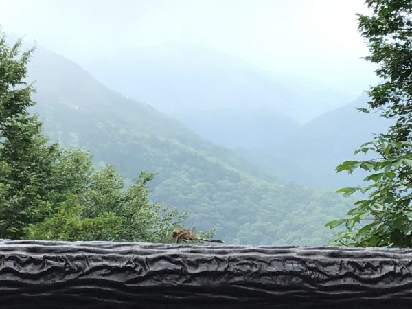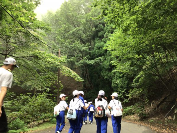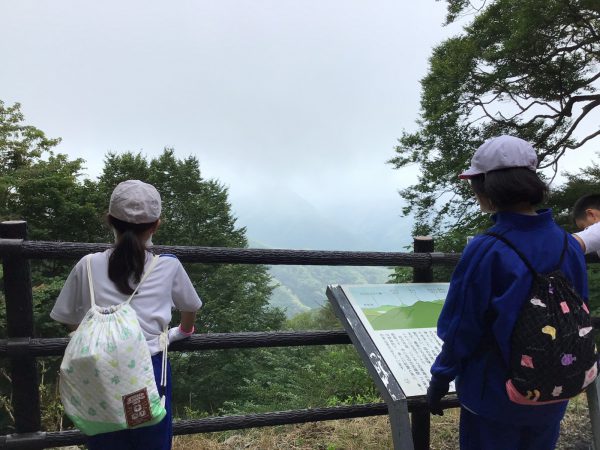 見晴らしのいい、雄大な自然の景色が見えてきました。山々が遠くまで連なります。山の上の方なので、ほんのり涼しい風を感じます。ここからは急な山道を上がります。