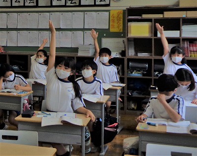 1時間目は算数です。現在は「垂直と平行」について学習しています。今日は「方眼紙を使って垂直と平行を書こう」という学習目標で取り組みました。