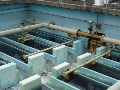 今日は、なんと、ろ過の際に砂に付いたゴミを洗浄する様子を見学できました。