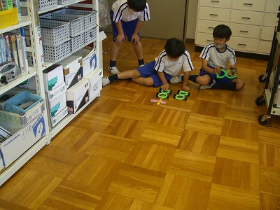 およそ走る距離をたしかめたところで、タイル何マス分走るか、5cmゴムを引いたときと10cm引いたときを調べます。