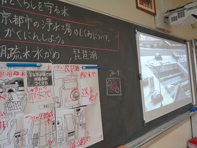 6時間目は社会です。京都市の浄水場のしくみについて学習しました。京都で使っている水は、琵琶湖から運ばれ、どのようにしてきれいな水になるのでしょうか。浄水場のしくみを映像で確認しながら、さまざまな装置や場所の名前を確認しました。