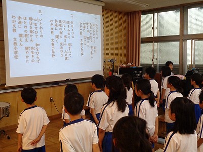 学習の前半は、前時に引き続き、「♪朝のリズム」を明るく歌いました。