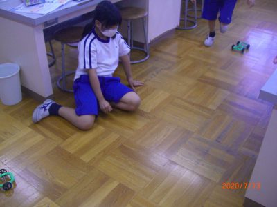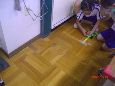 床のタイルの数で比べました。結果は予想通り、ゴムを長く引っ張れば遠くまで進みました。
