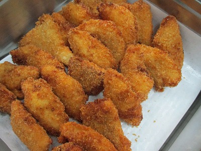 ☆ 白身魚はカレイを使っています。淡白な魚で食べやすいのが特徴的です。ひとつずつパン粉をつけて揚げる準備をしました。サクサクに揚がったフライをおいしくいただきました。
