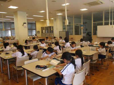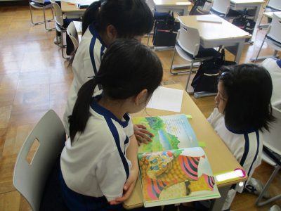 図書室へ行き、自分のお気に入りの本やみんなに読んでほしい本を、絵と文で紹介する学習をしました。