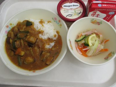 好きなメニュー1位のカレーと、苦手な野菜1位のなすを組み合わせ、苦手なメニューも食べやすくなるようにと、工夫を考えました。