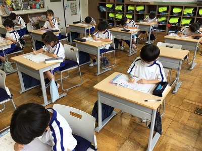 また、カタカナ「シ」の書き方の練習もしました。「ツ」とのちがいも考えながら、1・2画目を書く向き・書く場所、3画目の書き始めなど注意して練習しました。