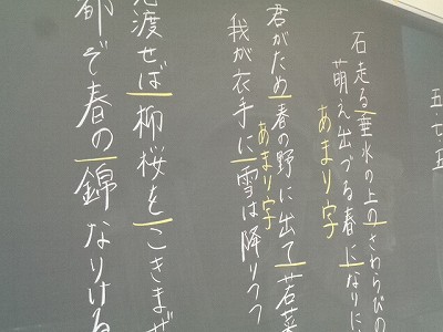 短歌は五・七・五・七・七、俳句は五・七・五+季語であることを確認し、今日は短歌を五・七・五に区切り、音読をしました。