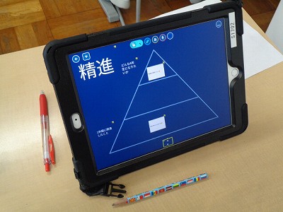 4年生の学年目標は「精進」です。タブレットで「ピラミッドツール」を使用し、理想の4年生になっていくために、1学期の中で精進出来たこと、2学期や3学期で精進したい事を、ピラミッドの3つの段階に分けて作成していきます。