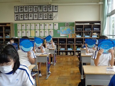 東西南北と身体をくるくる回しながら、星座早見板を使用してどの方角に星が見えるのかを探している4年生でした。