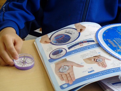 「電気のはたらき」の確認テストを行った後、方位磁針の使い方を確認し、星座早見板を使って、星の探し方を確認します。