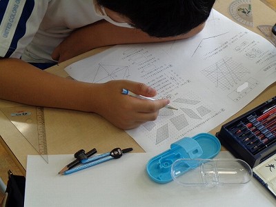 テストが続く木曜日でしたが、コンパスや三角定規を使って、作図もていねいに取り組んでいました。垂直・平行の意味や、台形・ひし形・平行四辺形の特徴についても、定着した様子でした。