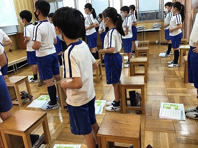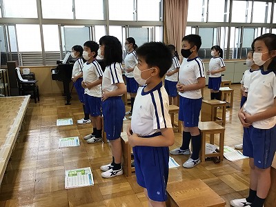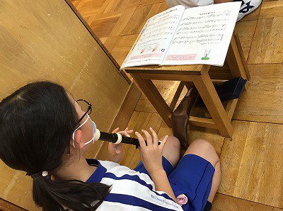 リコーダーの指使いを確かめる時間です。マスクを外した練習ができません。「ハローサミング♪」の階名を声に出しながら、“エア”で、リコーダー奏を行っています。