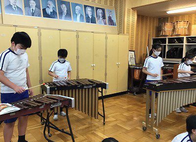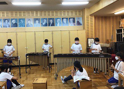 「♪茶色の小びん」のメロディにぴったりな“低音のひびき”を奏でようと、木琴・鉄琴を使って練習しました。