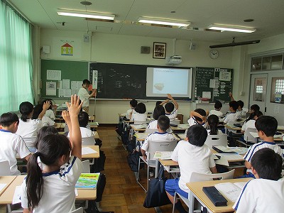 スクリーンを通して、クイズ形式の学習をしていました。