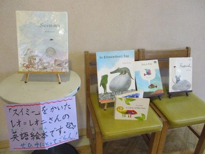職員室前に、レオ=レオニさんの英語絵本を5冊展示中です。