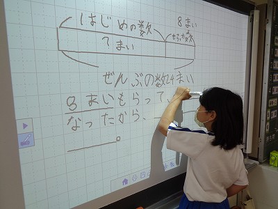 はじめの数やもらった数、ぜんぶの数などのキーワードを全体で確認し、テープ図に表しました。