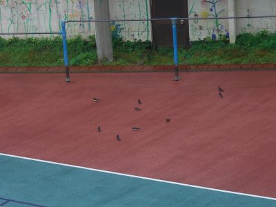 にかわ雨があがり、校庭にたくさん鳥がやってきました。