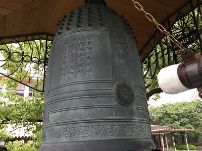 この鐘は「総願の鐘」という名称で、大学の構内に設置されています。この鐘の側面には「四弘誓願」のお経が刻まれています。私たちが聖日参拝で唱和するお経なので、親しみのあるフレーズです。このお経の一文目「衆生無辺誓願度(しゅじょうむへんせいがんど)」が、「生きとし生けるものすべての平和を願う」という意味を持っているのだそうです。