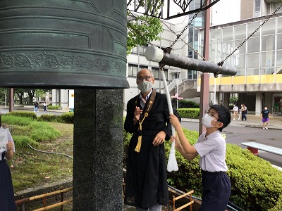 文教ボランティア隊が“平和の鐘”を鳴らそうと、宇治市の京都文教大学まで出かけました。私たちが実感する喜びや楽しさ、達成感など、平和だから感じることのできる有り難さを、メッセージにのせて宣言しました。