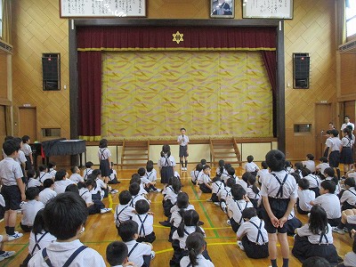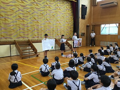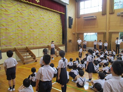 児童会本部の会長から一学期の振り返りがあり、「これからも一致団結して、明るく 正しく 仲よくの学校生活を送りましょう」という素敵なメッセージが伝えられました。