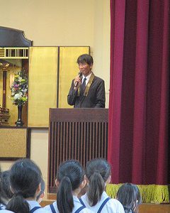 礼拝後、校長先生との挨拶で、文教キッズは元気いっぱい「おはようございます」が言えました。