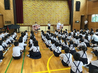 朝一番に開かれた「代表交代集会」の場を借りて、【服の力プロジェクト】を全校キッズに知ってもらう“広報活動”を行いました。