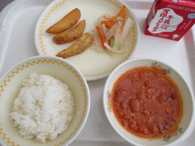 今日の献立は「チリコンカーン、おかか和え、ポテト」でした。 大根、人参、チンゲン菜、3種類の野菜を使用しています。 人参の栄養素はとくに皮の近く多くあります。 お家で食べるときは、よく洗って皮付きのまま調理するのもおすすめです。