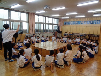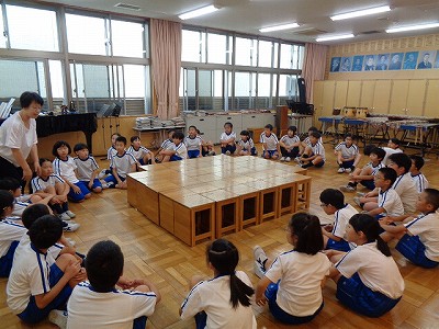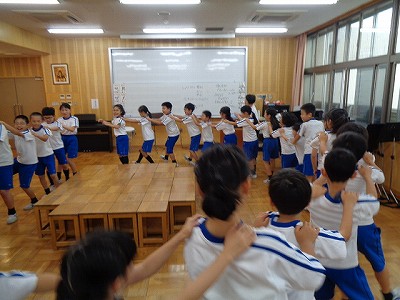 続いて2時間目音楽でも、キャンプファイヤーを想定して丸くなって座り、炎が上がるのを、または、鎮まるのを想定して、歌の練習をしました。