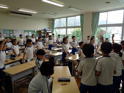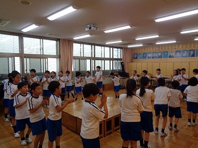 さて、今日は「朝ねっこタイム」に明明後日に控えた「琵琶湖自然教室」でのレクリエーションについて、係から説明がありました。