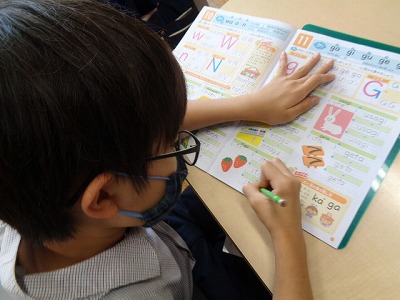 「香港」や「桑港」など、特別な読み方を伝えると、ドリルの空いている場所に書き写し、興味津々の3年生。
