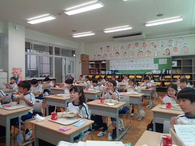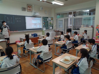 とても喜ぶ1年生。子ども達は、想像をかきたてる楽しい"うそ"たっぷりの面白い絵本を聞きながら、野菜たっぷり焼きそばを、よ~く味わって食べていました!
