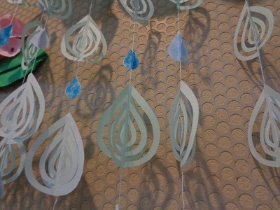 雲に続いて、雨つぶも立体的です。どうやって切ったのでしょう?
