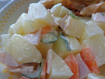 じゃがいもに含まれるビタミンCは、でんぷんに守られているため、加熱しても壊れにくいです。きゅうり、人参とハムも合わせて作りました。人参はお味噌汁に入れるようないちょう切りにすると、食べごたえがあって、さらにおいしくなります。