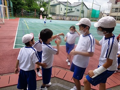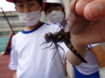 掃除終了時刻です。運動場を掃除していた6年生が、トンボをつかまえました。