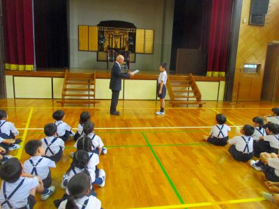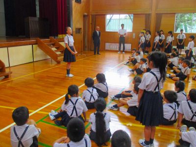 児童会代表メンバーとして、各委員会の委員長・副委員長と各学年の学級代表が、その場で起立し、代表で児童会会長が、みんなに感謝の気持ちを伝えました。