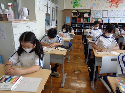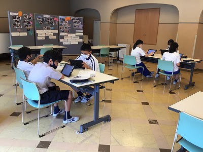 昨日と今日にわたり、活動後に作成した各自の新聞を手に、“調査報告”のポイントを見極め、タブレットのロイロノートを活用した資料作りを行いました。