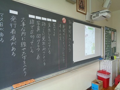 新聞には「見出し」がついていることや、発行者名、日付が書かれていること、図やグラフ、写真などを使ってより分かりやすくしていることなどを、みんなで意見を出し合いながら、学習しました。