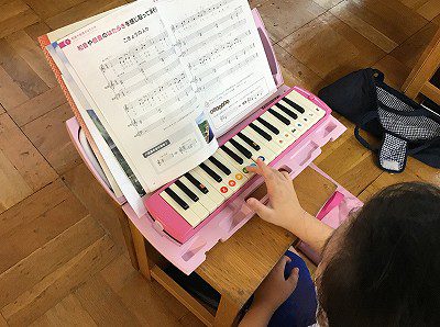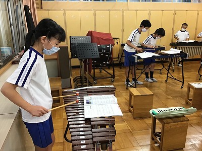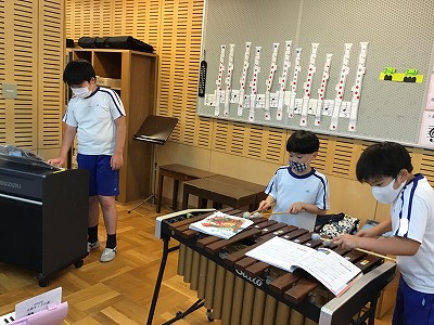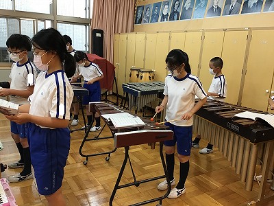 マリンバやバス木琴、バスマスターなど低音を受け持つ楽器を使って演奏するために、練習の順番を待つ間は、鍵盤ハーモニカの“鍵盤”で練習します。