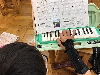 「♪こきょうの人々」の低音パートを鍵盤ハーモニカで確かめています。今日は、友達の歌声に合わせて、低音の音を重ね、そのひびきを感じ取ることが目当てです。