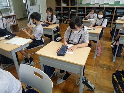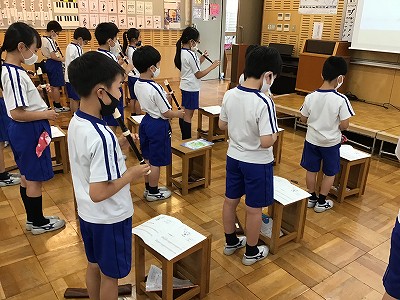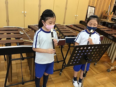 “リコーダーの構え”は、オンライン学習の時から伝えてきたポイント。使っていない指の置き方、姿勢に注意して、練習が進みました。