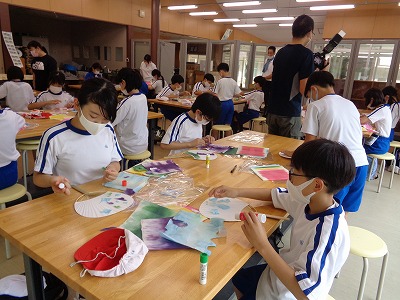 和紙をちぎってデザインをイメージし、うちわに貼っていくアートを楽しみます。